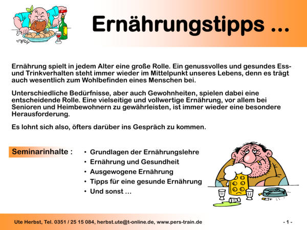 •Stress und die richtige Balance im Leben - Entspannungstechniken•Perspektiven mit 50+•Perspektiven mit 60+•Für mehr Wohlbefinden - Positive Psychologie (Vortrag)•Warum weniger manchmal mehr ist …